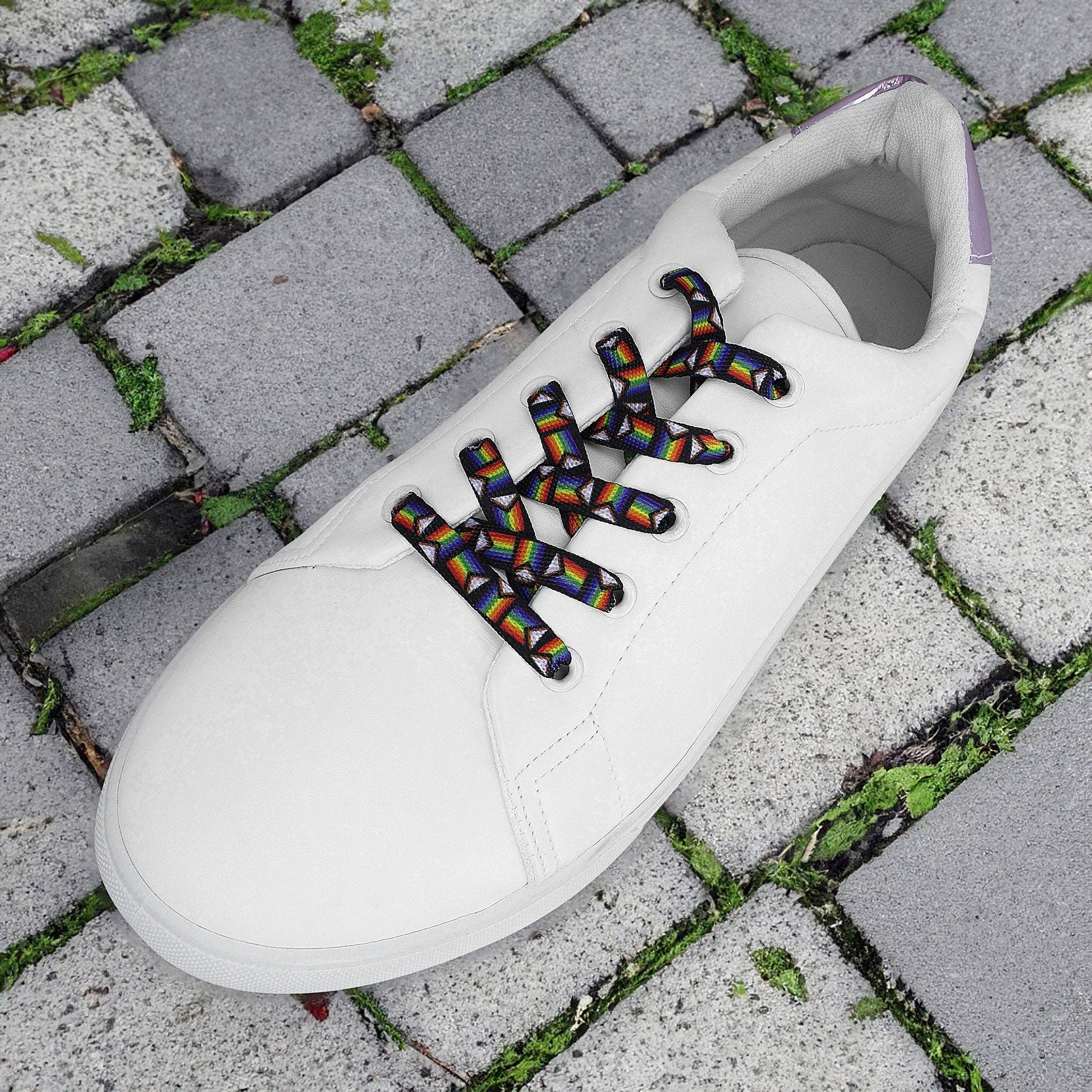 These gay pride Daniel Quasar Pride Flag shoelaces are striped with Daniel Quasar's Progress Pride Flag. Sell these at pride parades or other pride events. The high quality Shoelaces are 56 inches long and a bit more than 1/4 inch wide. Each pair comes coiled in a bag.
